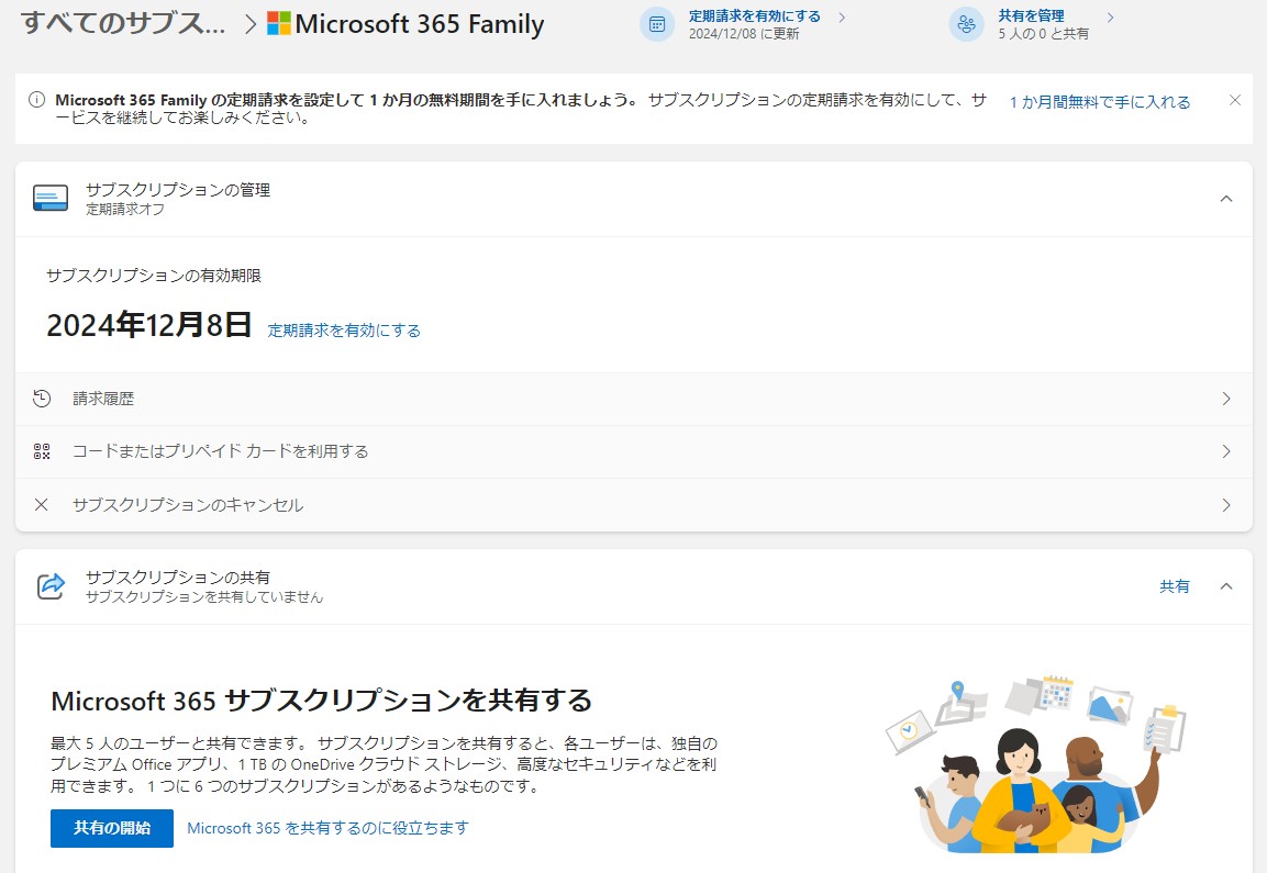これをFamilyで更新するとどうなるかというと、何だかよく分からないけど残っていた期間もそのままMicrosoft 365 Familyになるようです!↓これが更新後の状態。