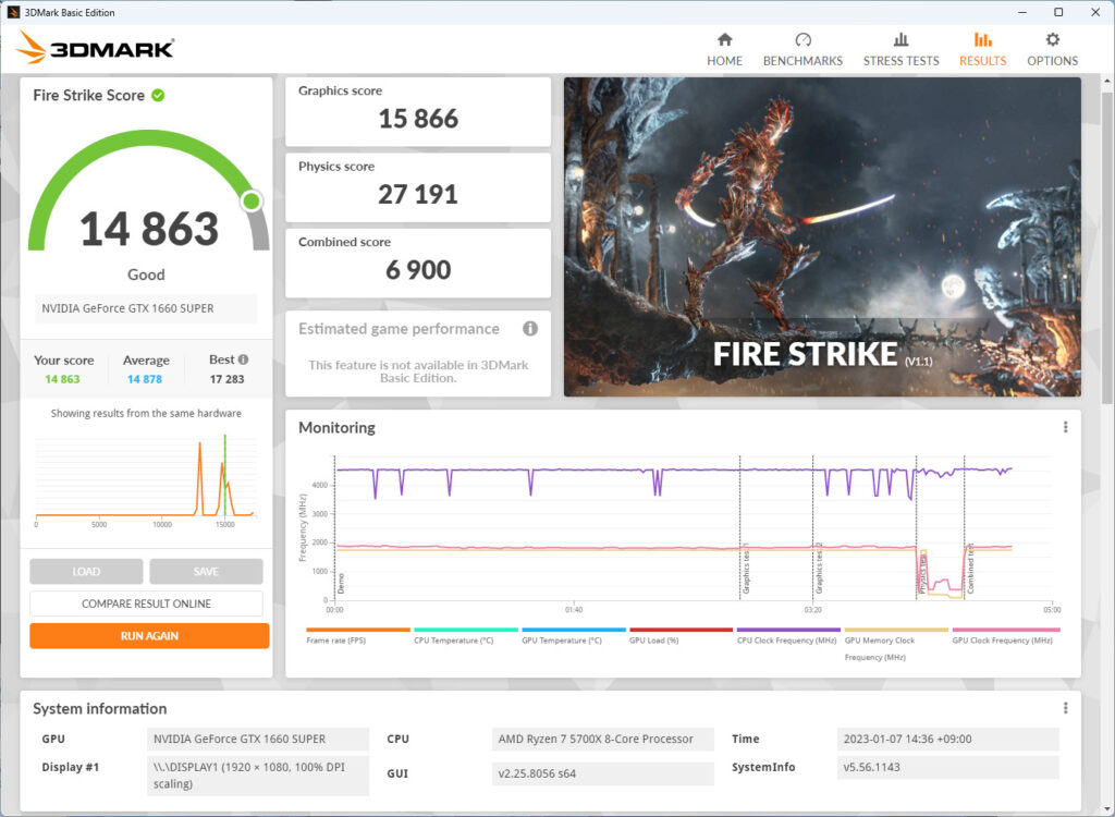 ベンチマークの結果はGTX 1060 3GBと比較して、DirectX 11の性能を計る3DMark Fire Strikeで34%アップ、DirectX 12の性能を計る3DMark Time Spyで48%アップとなりました。
